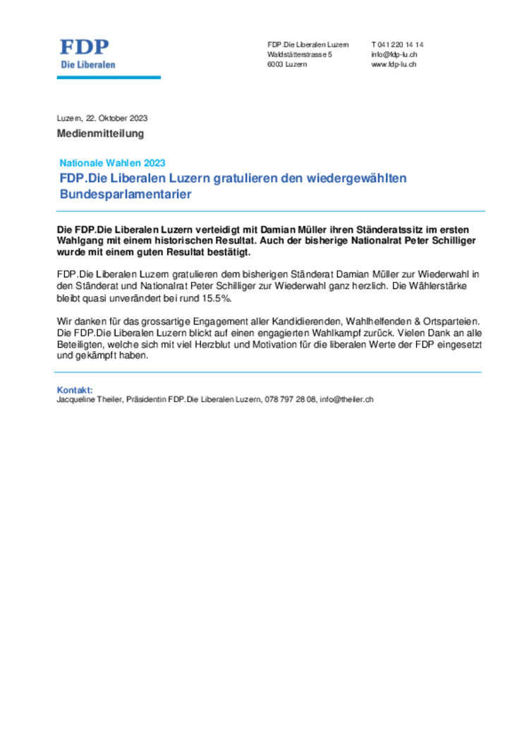 FDP.Die Liberalen Luzern gratulieren dem bisherigen Ständerat Damian Müller zur Wiederwahl in den Ständerat und Nationalrat Peter Schilliger zur Wiederwahl ganz herzlich. Die Wählerstärke bleibt quasi unverändert bei rund 15.5%.